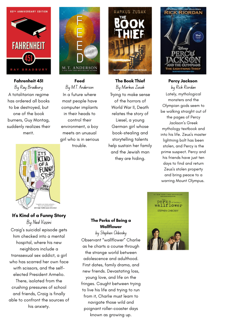 It was fun to ‘research’ into what recommended readings there might be for his age-group, 17+. I haven’t interacted with that age-group in the library much yet, and while I remember what I was reading in high school at that age, I’m unaware of most that have been published since. I curated a selection of “recommendations” divvied into genres with little blurbs on the plot to pique interest. I included some listed written titles as well, just so I wasn’t spending 10 pages on these cut outs… I ordered a few that I listed from Thrift Books, so those have been slowly trickling in.